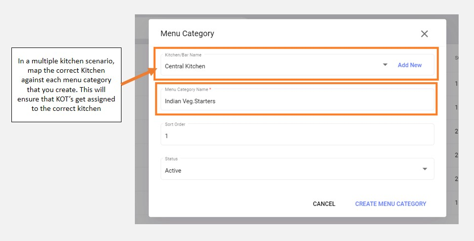 - Select the appropriate kitchen for this menu category from the kitchen selection drop-down. The correct kitchen selection in this segment will ensure that KOT’s related to this menu category are printed in this kitchen