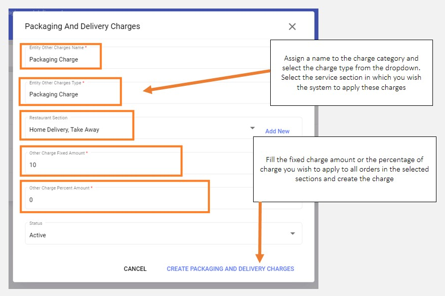 Other charge categories should have its calculation logic defined appropriately. An outlet can either apply a flat charge on the bill or can have a percentage of the bill amount applied as a charge. Either way, the user will have to fill the required calculation logic details in the respective fields. If an outlet chooses to apply a flat charge, they will have to fill the flat charge value in the