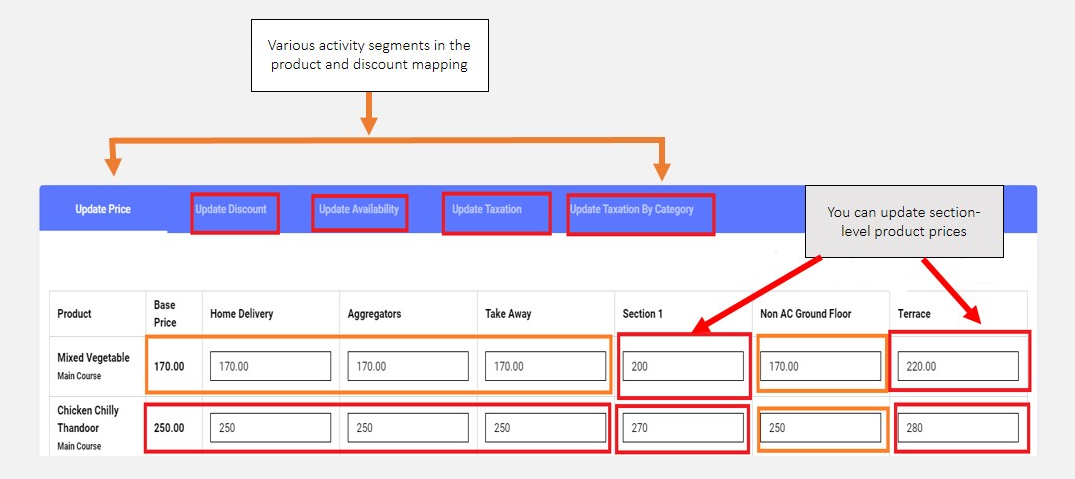 Click Product Discount Mapping from the entity settings menu options, and visit the Pricing Update segment to start setting up section-level prices for the outlet, and integrated with the QRkey systems. Outlets may have different product prices for different service sections depending on their type of operations.