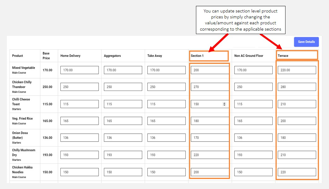 - To update section-level prices of each item, simply double click the respective editable cell against each item coinciding with the applicable section name and fill the applicable prices.