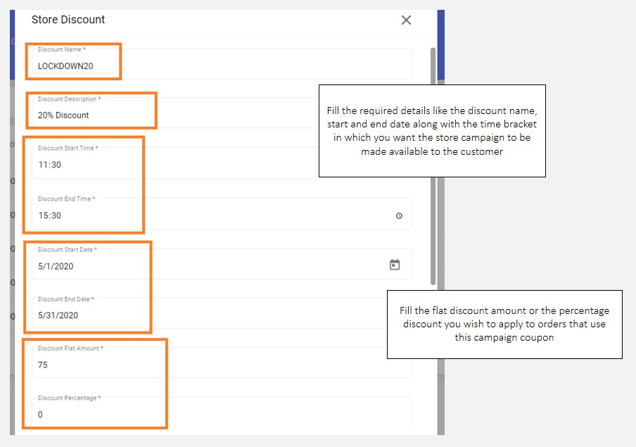 Store discounts should have its calculation logic defined appropriately. An outlet can either apply a flat discount on the bill or can have a percentage of the bill amount discounted as a part of the campaign. Either way, the user will have to fill the required calculation logic details in the respective fields. If an outlet chooses to apply a flat discount, they will have to fill the flat discount value in the