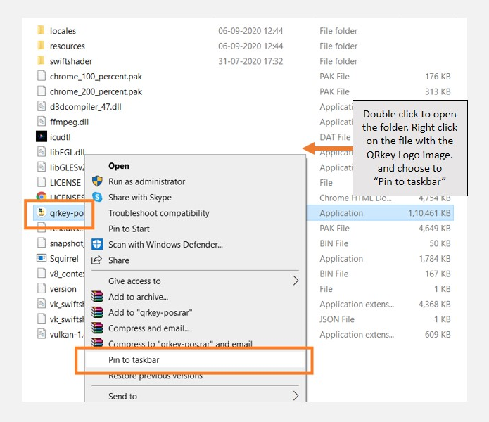 - Open this newly created QRkey setup folder. Right-click on the QRkey POS file in this folder and click, pin to taskbar