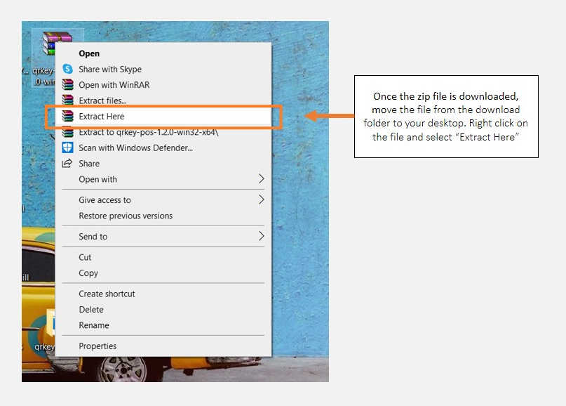- Right-click the QRkey zip file on the desktop and choose the extract here option. A new folder with the QRkey setup files will get created on the desktop