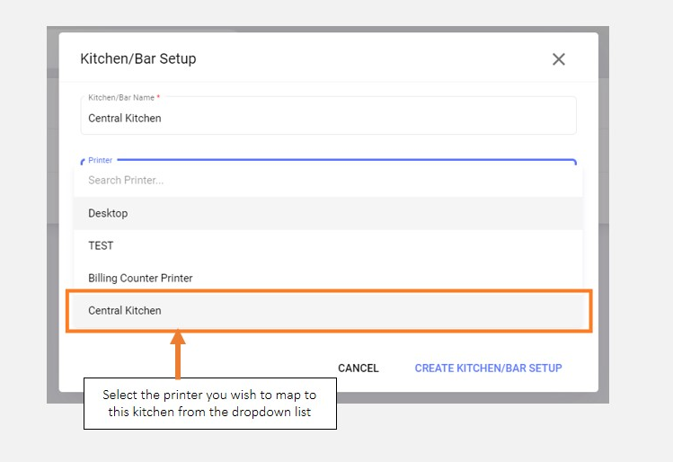 Printers that you assign to each kitchen section using this step of the set-up process, will be utilized for printing the KOT during live operations at your outlet.