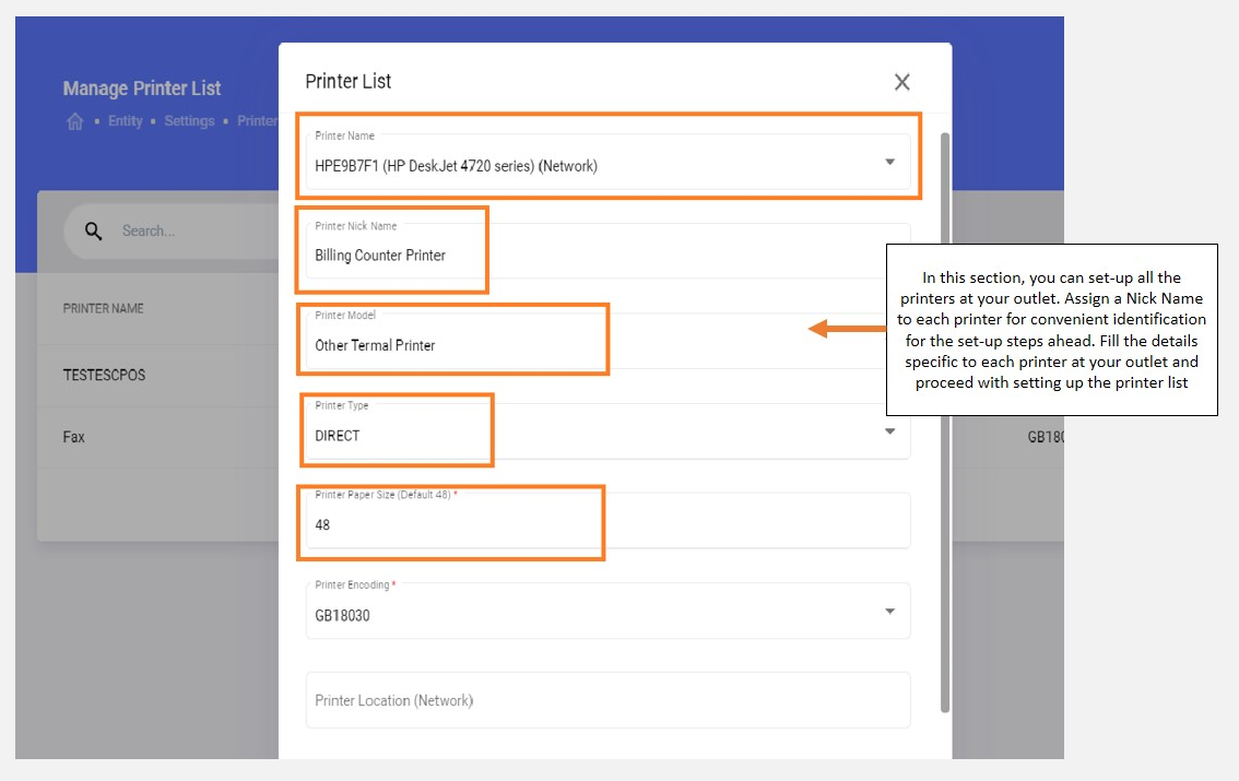 Click Printer Setup from the entity settings menu option to start setting up the printers you would like to use for various purposes at the outlet, and integrated with the QRkey systems. Outlets may have one or more printers, depending on their type and size of the operations. Some outlets may have a separate kitchen (Kitchen Order Ticket - KOT), Bar (Bar Order Ticket - BOT) and Section (Billing) specific printers and others might use just one printer for all their kitchen/Bar and billing requirements.
