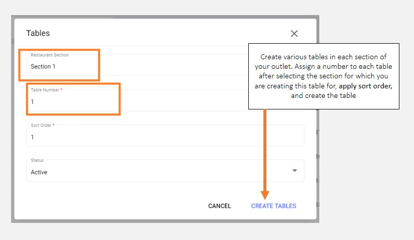 - Creating at least one table each for home delivery and takeaway sections is mandatory